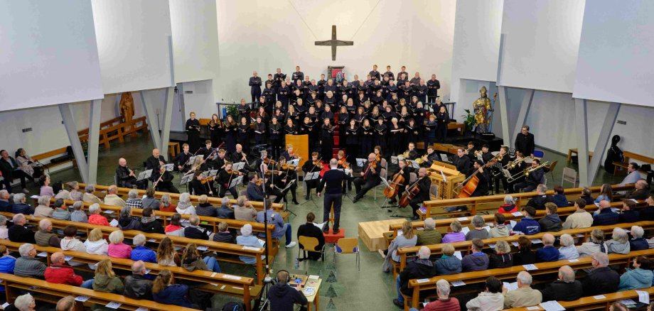 Der Jubiläumschor wurde dabei von dem Vokalensemble St. Benedikt, tonART Fulda und dem Kammerchor Bad Orb unterstützt, für die orchestrale Begleitung sorgte die renommierte Kammerphilharmonie Mannheim. Als Solisten begeisterten Isabell Weller (Sopran), Johanna Münstermann (2. Sopran) und Ralf Emge (Tenor) das Publikum.