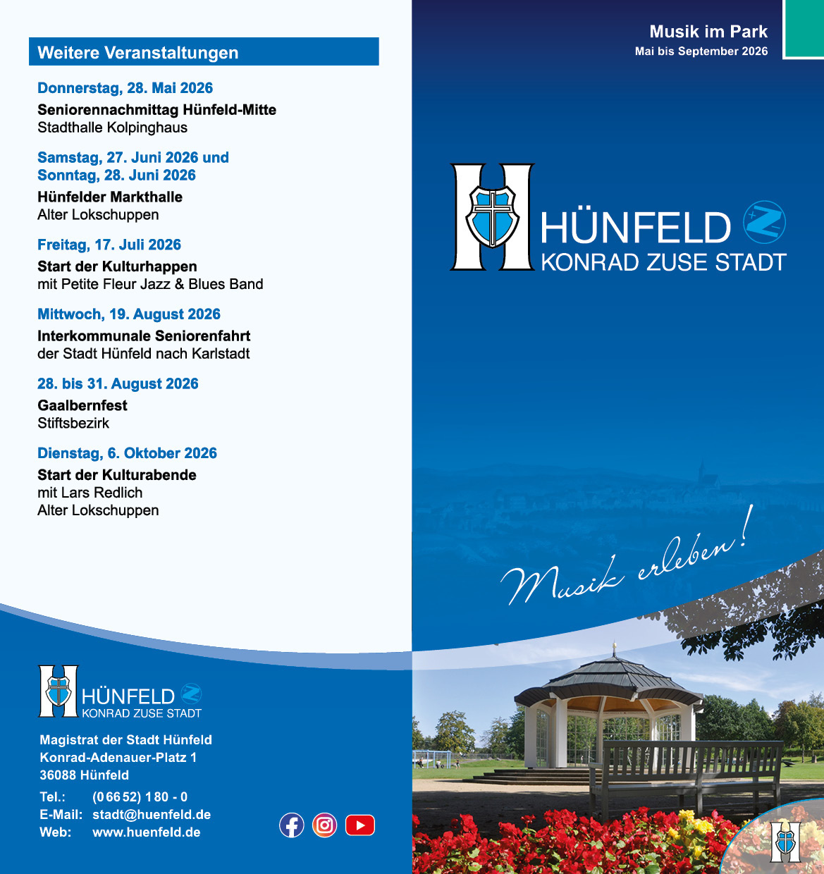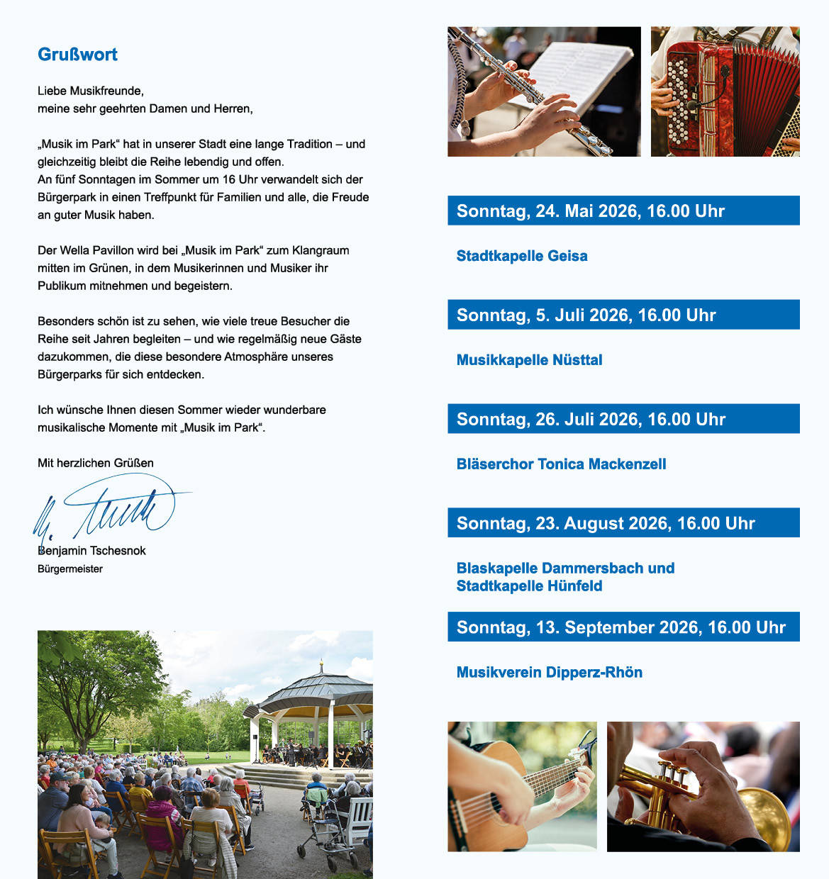 Bürgermeister Benjamin Tschesnok freut sich, dass es wieder los geht und hebt die lange Tradition der beliebten Musikreihe hervor: „Es ist schön zu sehen, wie viele treue Besucher dieses Unterhaltungsangebot der Stadt Hünfeld seit Jahren begleiten, und wie regelmäßig neue Gäste hinzukommen, die diese besondere Atmosphäre unseres Bürgerparks für sich entdecken und genießen“.