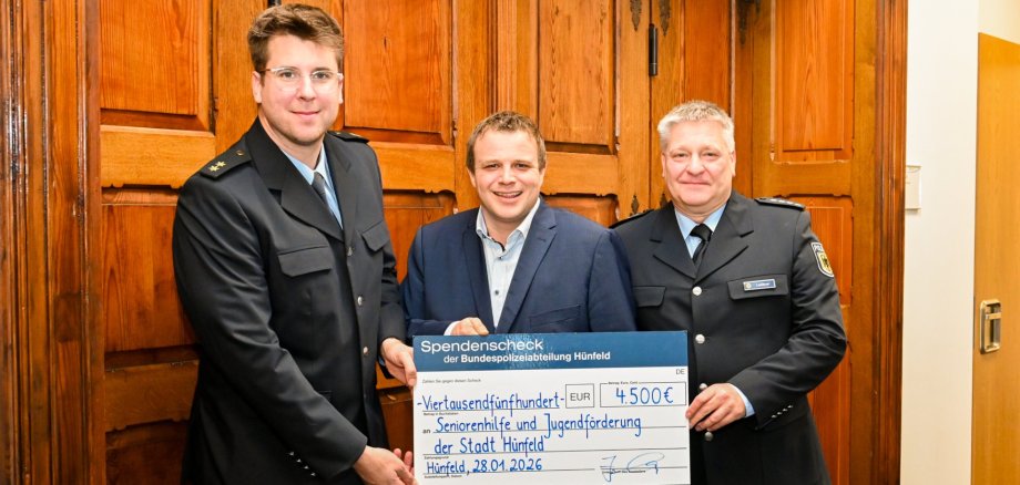 Über 500 Gäste kamen zum Jubiläumskonzert in die Hünfelder Stadthalle und sorgten für ein nahezu ausverkauftes Konzert. „Wir freuen uns, die Einnahmen aus dem Kartenverkauf überreichen zu dürfen“, erklärten Jürgen Lackner und Julian Neumann von der Bundespolizei bei der Übergabe des Spendenschecks an den Bürgermeister. Das Geld sei gut angelegt, erklärte Benjamin Tschesnok. Wie in den Vorjahren werde mit der Zuwendung auch dieses Mal wieder die Aktion Seniorenhilfe und die Jugendförderung der Stadt Hünfeld unterstützt.