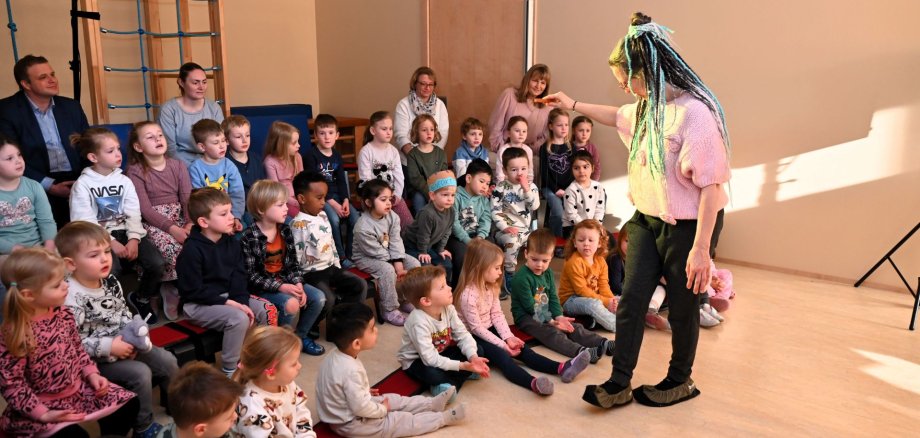 Die Kinder folgten gebannt den Puppenspielern, sangen bei den Liedern von Sabine und Jürgen Jordan mit und belohnten die beiden mit jeder Menge Applaus. Auch Bürgermeister Benjamin Tschesnok und Stadträtin Karin Grosch schauten beim Marionettentheater vorbei, wünschten den Kindern viel Spaß und dankten insbesondere der Wella-Kulturstiftung. In der Konrad-Zuse-Stadt ist es mittlerweile Tradition, dass dank der Stiftung jedes Jahr abwechselnd in allen Kindertagesstätten und für die Grundschulen Kindertheaterveranstaltungen stattfinden. Mehr als 13.600 Kinder haben seit 2003 dieses Angebot genutzt. Die Wella-Kulturstiftung hat die Veranstaltungsreihe bereits mit rund 55.500 Euro gefördert.